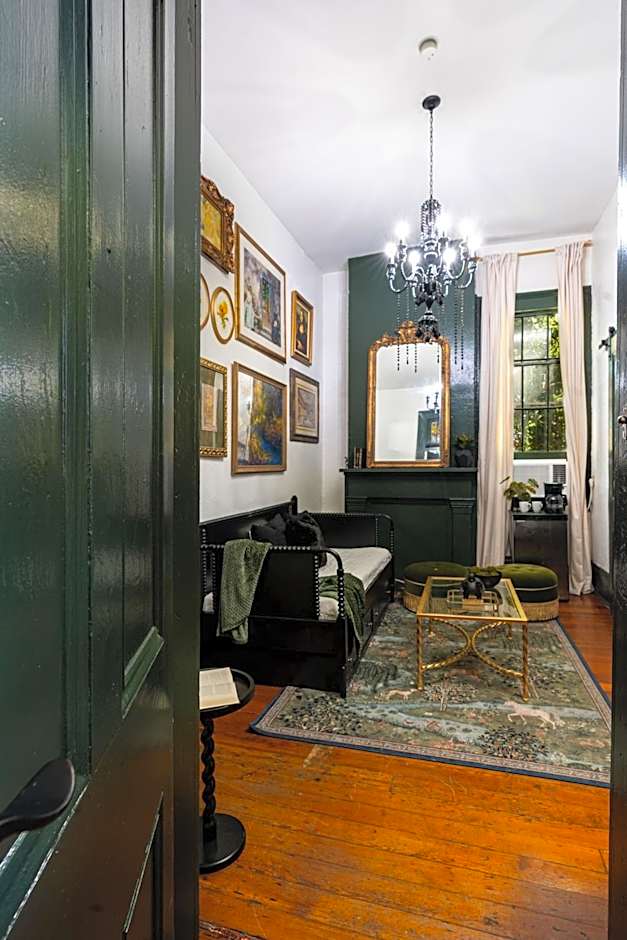 This suite has a window unit for AC and a room heater during winter. Private private bathroom with a claw-foot tub is provided as well. This unit is on the 2nd floor.