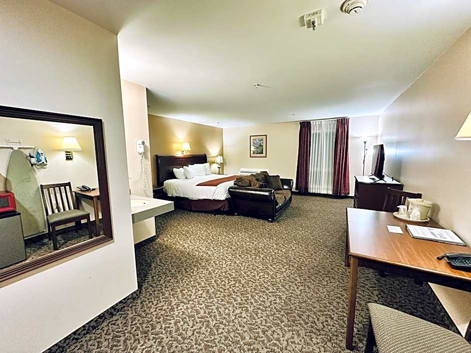 The handicapped accessible king bed room was large and had a leather love seat as well as a table and two comfortable chairs seating area. The bed was very comfortable. The AC unit was fairly quiet and kept the room at a comfortable temperature. The hot breakfast was OK, but the scrambled eggs were not that great.