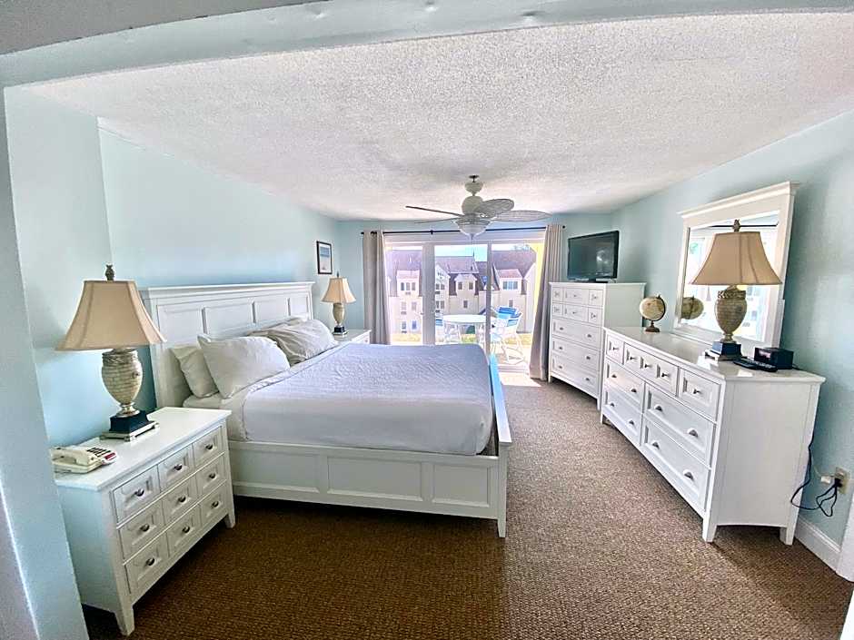 Our beautiful one-bedroom condos sleep up to four guests. Each unit will have either a king or queen bed and a sleeper sofa to accommodate up to four guests. All one-bedroom units have a full living room and kitchen with a small dining area as well. These units are down a single flight of stairs and a patio off of the bedroom. These units have two bathrooms as well! Please note that all units are individually owned so they will differ in decor and tier. Specific room requests may not be met.