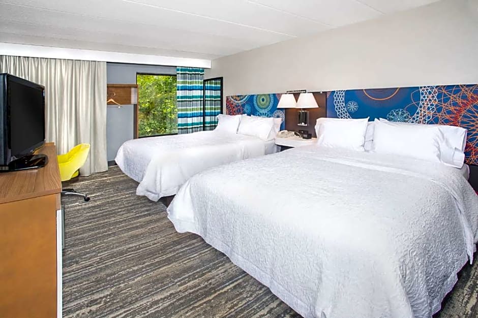 Living room, kitchen, 2 LCD TVs, work desk, coffeemaker, free WiFi access Find all the space you need in this spacious suite two-room suite featuring a fully-equipped kitchen with a microwave, refrigerator, dishwasher and a two-burner stove. Relax in the living room with a comfortable sofa, an armchair and a 37-inch LCD TV. The bedroom includes a clean and fresh Hampton bed® and a second 37-inch TV. Enjoy additional amenities like a large work desk, free WiFi and a coffeemaker. The bathroom contains plush towels and a shower featuring a curved shower rod for added space and light.