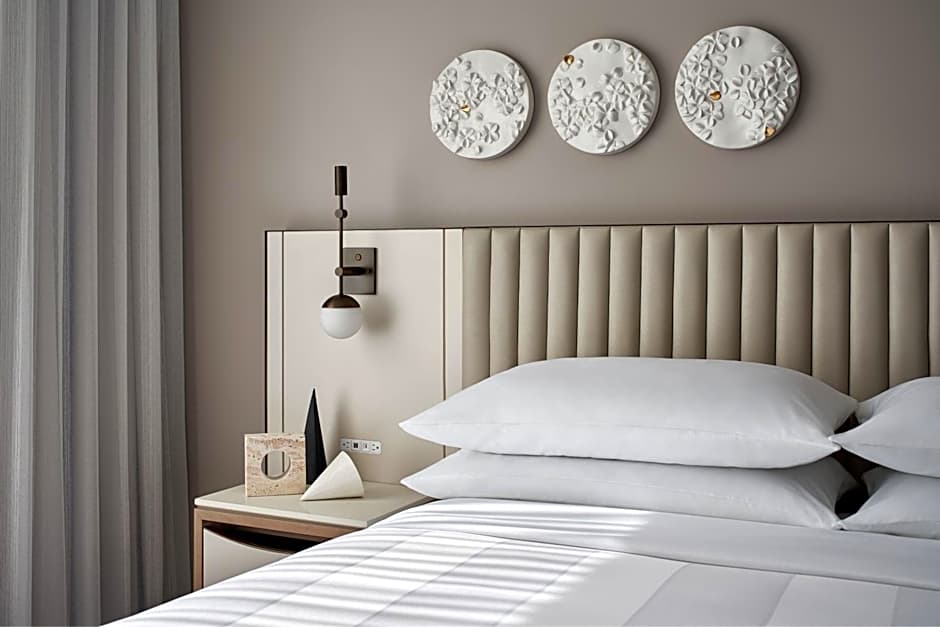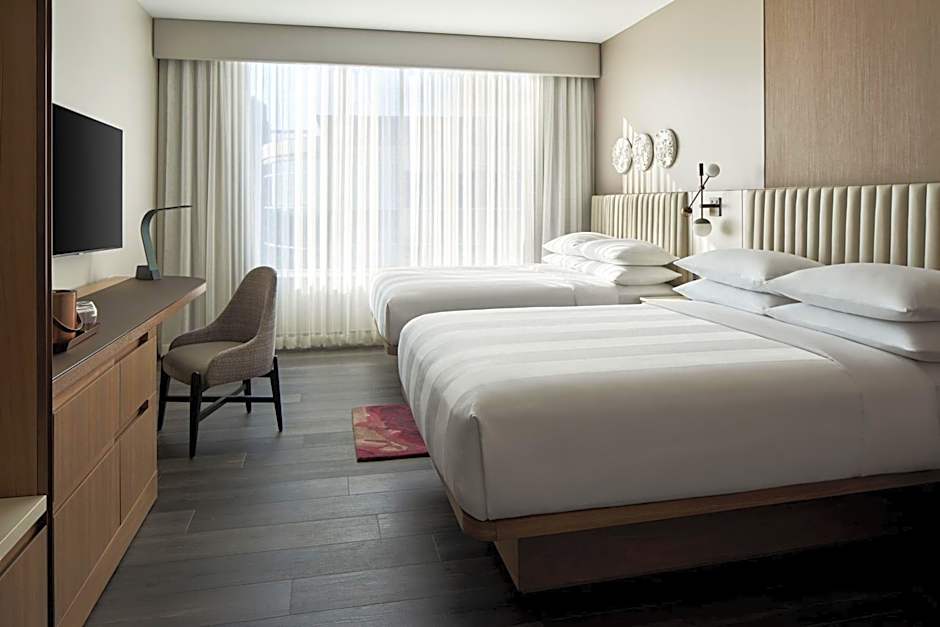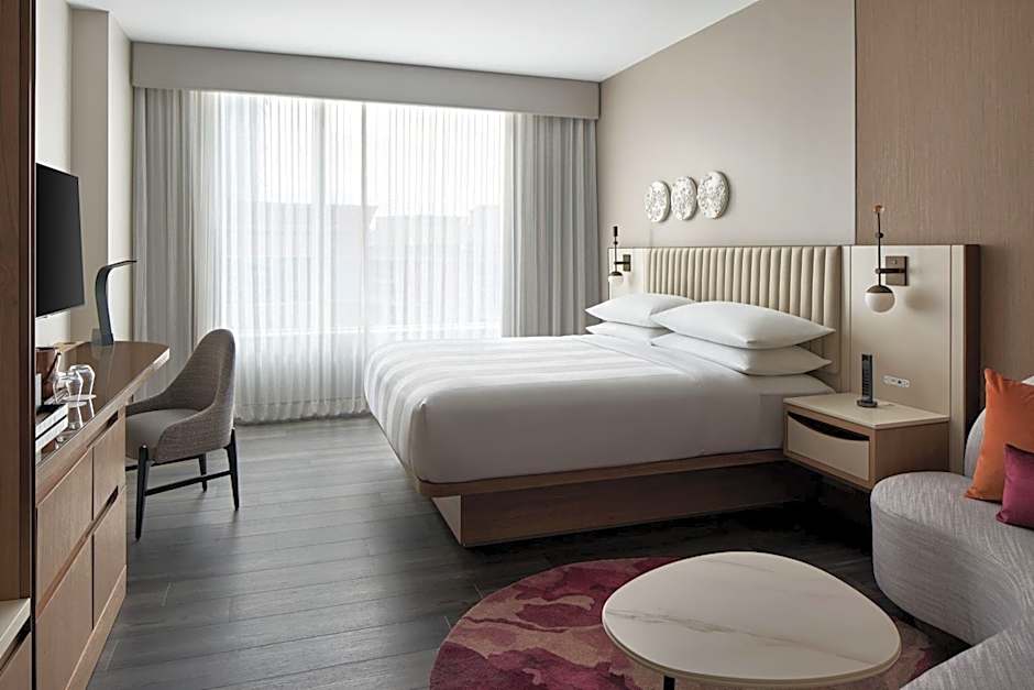The Marriott Bethesda Downtown at Marriott HQ offers a variety of room types including double rooms and suites. The double rooms have either two queen beds or one king bed, and can accommodate 2 adults and 1 child or 4 adults and 3 children. The suites have a king bed and a sofa bed, and can accommodate 3 adults and 2 children. Smoking is not allowed in any of the rooms. The room sizes range from 334 sqft to 689 sqft.