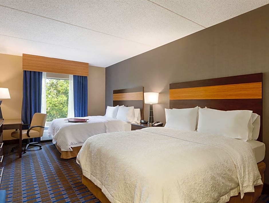 The rooms available at Hampton Inn and Suites Camp Springs include King Studio with Sofa Bed, King Room - Disability Access/Non-Smoking, Queen Room with Two Queen Beds - Hearing Accessible/Non-Smoking, Queen Room with Two Queen Beds, King Room, and Queen Studio with Sofa Bed. Smoking is not allowed in any of the rooms. The rooms range in occupancy from 2 adults and 1 child to 5 adults and 4 children. Bed sizes vary between King size beds, Queen size beds, and Sofa beds. The size of each room is 301 sqft.