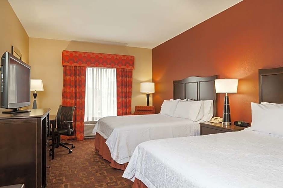 Any corresponding photo may not reflect the specific accessible room type or room feature. This hearing accessible, non-smoking room features two queen-sized beds. The room also has a visual alarm and notification devices for the doorbell or door knock and incoming phone calls. The room features our luxurious clean and fresh Hampton bed, comfortable soft seating, microwave, refrigerator, a HDTV, and easy to operate alarm clock/radio. In the bath you will enjoy a WaterPik shower head and curved shower rod. The free high-speed internet access will help you stay connected while on the road. If you prefer not to work at the desk, you can use the convenient lapdesk instead. You'll also enjoy the convenience of having a coffee maker with tea service and iron/ironing board in your room.