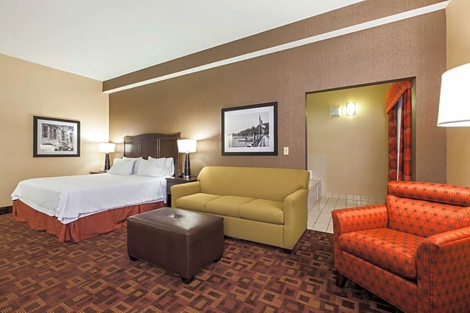 Whirlpool, microwave, mini-refrigerator, sofa bed, desk, 37-inch TV, free WiFi Relax in this king suite with a clean and fresh Hampton bed® and whirlpool tub. Sink into the sofa bed and watch movies on the 37-inch HDTV. Surf the web with free WiFi. Catch up with work at the desk with ergonomic chair. Refresh your senses in the bathroom, complete with a shower and plush towels. Enjoy the convenience of having a microwave, mini-refrigerator and coffeemaker in the room.