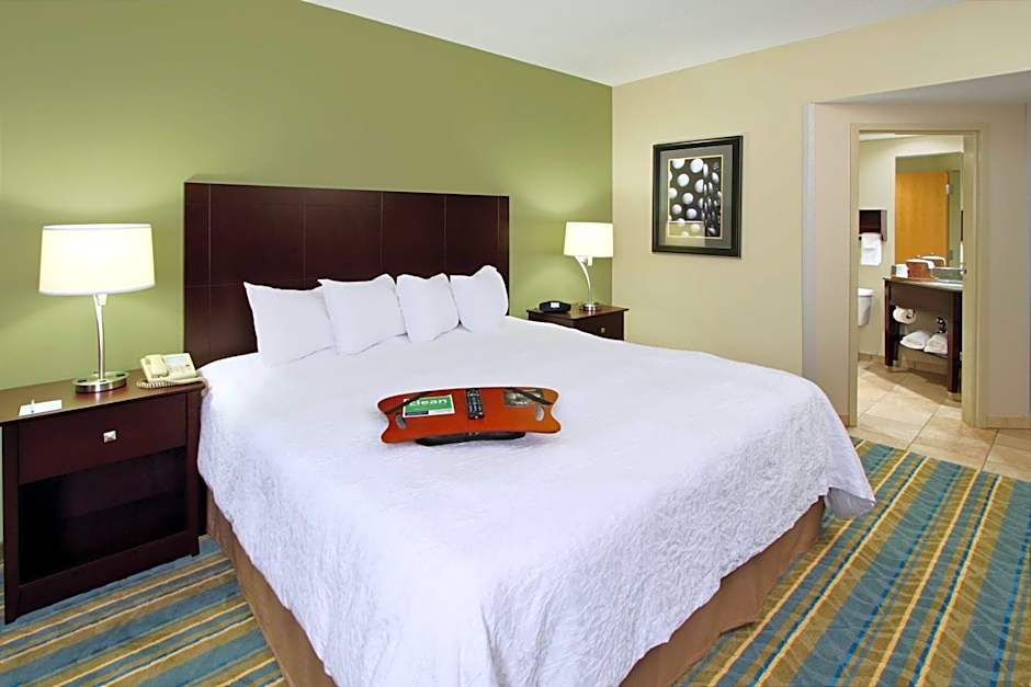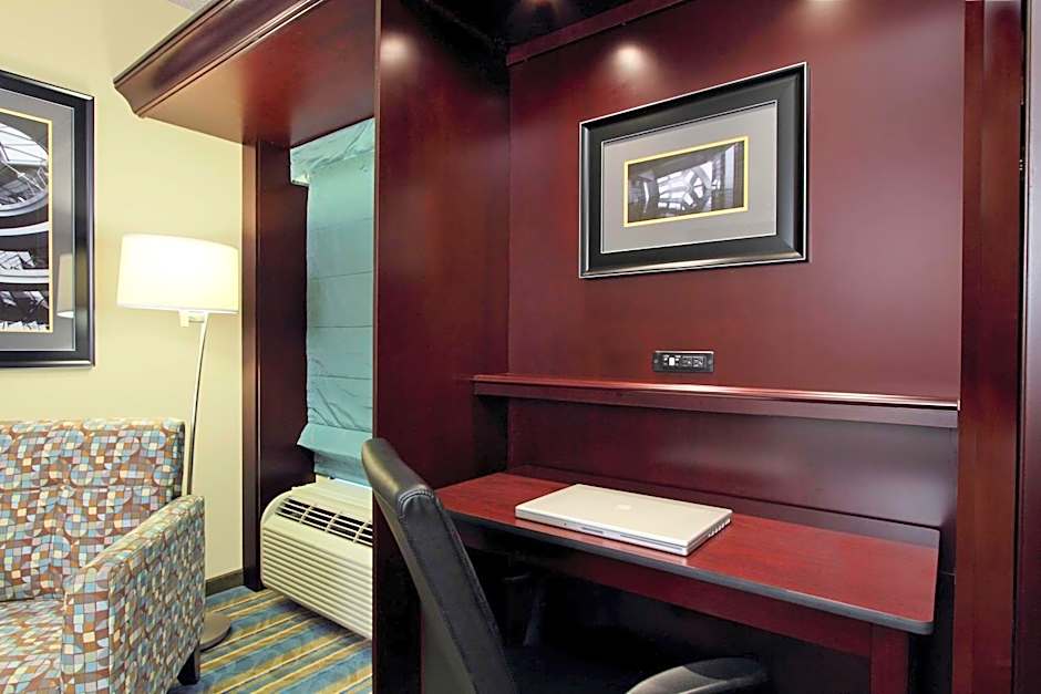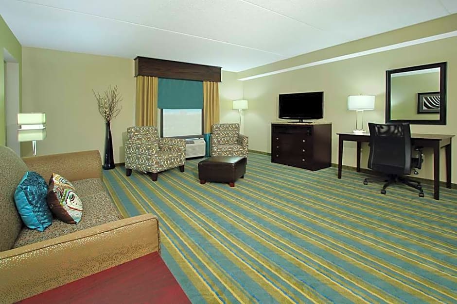 37-inch LCD HDTV, work space, seating area, free WiFi Relax in this spacious two-room suite featuring a clean and fresh Hampton bed® and a 37-inch LCD TV with HD channels. Curl up on the sofa in the seating area, which also boasts a recliner or lounge chair. The large work desk and free WiFi are useful for catching up on business while traveling. The bathroom contains plush towels and a curved shower rod, offering more comfort and space when showering. Prepare drinks or snacks with the handy coffeemaker, microwave and refrigerator.