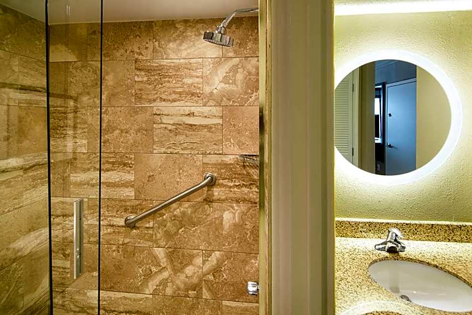 This mobility and hearing accessible standard room features one king-sized bed, and a roll-in shower. The room also has a visual alarm, and notification devices for the doorbell or door knock and incoming telephone calls. 225 sq. ft., WiFi available, in-room safe, 40-inch HDTV, clock with MP3, as well as Hairdryer, Iron, and Coffeemaker. Any corresponding photo may not reflect the specific accessible room type or room feature.