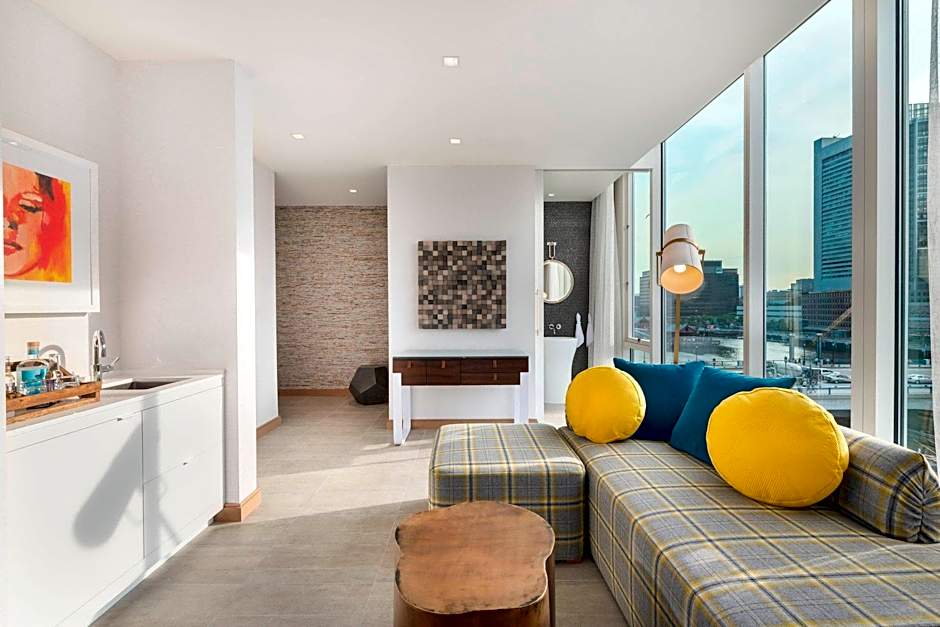 A great new, contemporary hotel for walking around the seaport district and downtown & Boston harbor. There are many excellent restaurants are within walking distance. I had a nice-sized king-corner room with a lot of glass. While there was not a lot to see out the windows...the room was large, quiet, comfortable, and bright with floor-to-ceiling glass. While I did not make it up to the rooftop bar...it did draw a crowd on the weekend and looked to be interesting. If you would like a new contemporary hotel ... this would be a good choice.