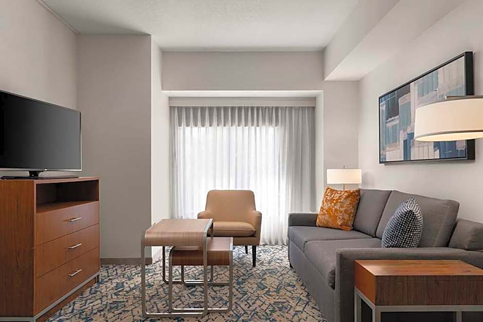 The hotel offers various types of suites including King Studio Suites, Two Bedroom Suites, and One-Bedroom Suites. All rooms are non-smoking and can accommodate multiple adults and children. The bed sizes range from King size beds to Queen size beds, and some rooms also have sofa beds. Some suites are designed for hearing accessible guests and have accessible features such as roll-in showers or bath tubs.