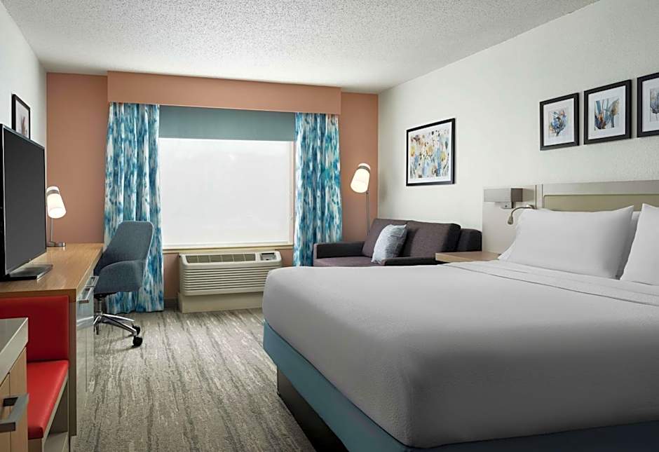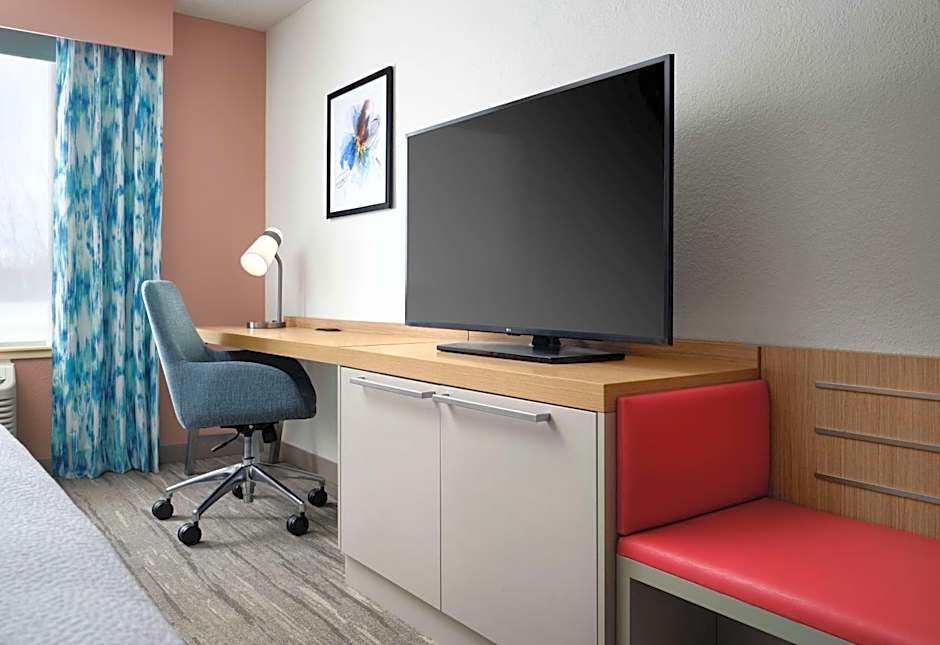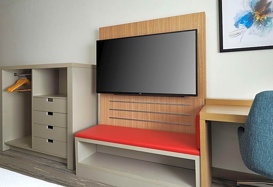 This mobility accessible, standard room features one king-sized bed and a roll-in shower. Other amenities include white duvet, work desk, ergonomic chair, 36-inch HDTV, a microwave, refrigerator and coffee/tea maker. This room is equipped with a roll-in shower with attached accessible seating, lowered vanity in bathroom and lowered shelf in closet.