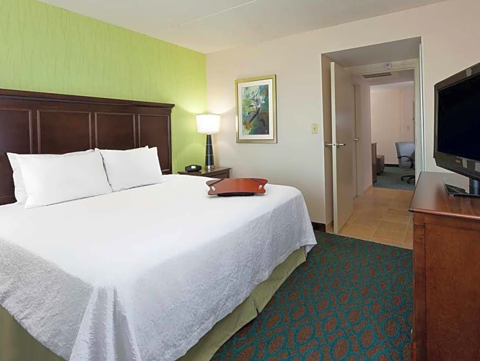 Easy chair with ottoman, 32-inch HDTV, work space, coffeemaker, free WiFi Unwind in this guest room which offers one king-sized clean and fresh Hampton bed®, a comfortable seating area and a 32-inch HDTV. Refresh in the bathroom with a WaterPik showerhead and fluffy towels. The curved shower rod provides extra space and light when showering. Work in comfort at the large desk and stay connected with free WiFi access. Additional amenities include a handy coffeemaker.