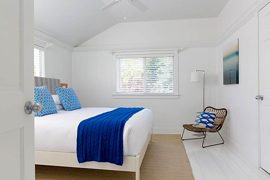 Located across the street from the main hotel building at ground level, the Two-Bedroom Queen Cottage offers a living area, two separate bedrooms, private porch and full kitchen. This cottage can adjoin the One-Bedroom King Cottage with Roof Deck located directly above it—together they can accommodate larger groups or families. A private bathroom off the kitchen offers a vanity, jetted tub/shower combo.