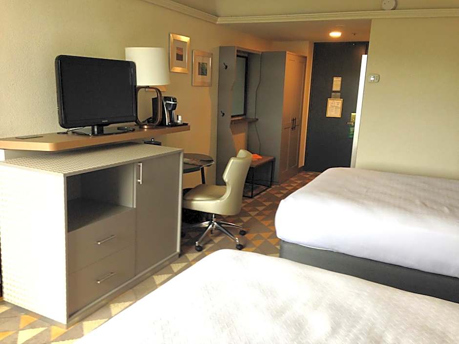 ADA compliant room. Two Queen beds allowing you to watch our Satellite Channels in comfort. Mobility bathroom to aid you in your morning routine. Keurig maker to help you wake up in the morning along with an alarm clock. Plenty of charging ports to keep all your devices fully charged. Complimentary WIFI and work desk to get those last minute items completed.