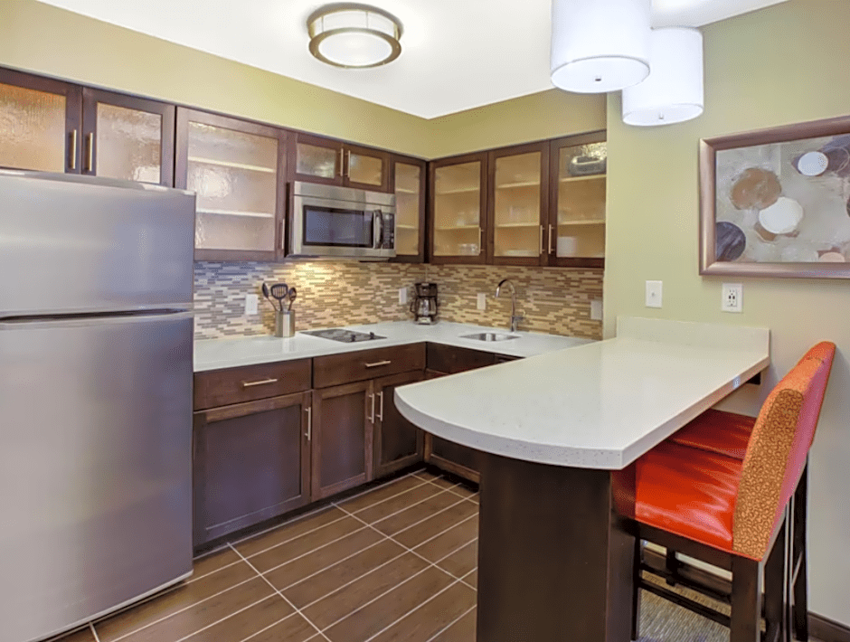 We had numerous rooms here for our son's wedding. We booked here because of them being suites with kitchens. We were pleasantly surprised how nice the rooms and kitchens are. Carts for luggage were super helpful. The tall showers were great . MY Husband is 6'5 and he was happy not to have to stoop over to shower