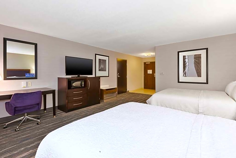 This hearing accessible, non-smoking room features two queen-sized beds. The room also has a visual alarm and notification devices for the doorbell or door knock and incoming phone calls. The room features our luxurious clean and fresh Hampton bed, comfortable soft seating, a HDTV, and easy to operate alarm clock/radio. In the bath you will enjoy a WaterPik showerhead and curved shower rod. The free high-speed internet access will help you stay connected while on the road. If you prefer not to work at the desk, you can use the convenient lapdesk instead. You'll also enjoy the convenience of having a coffee maker with tea service and iron/ironing board in your room. Any corresponding photo may not reflect the specific accessible room type or room feature.