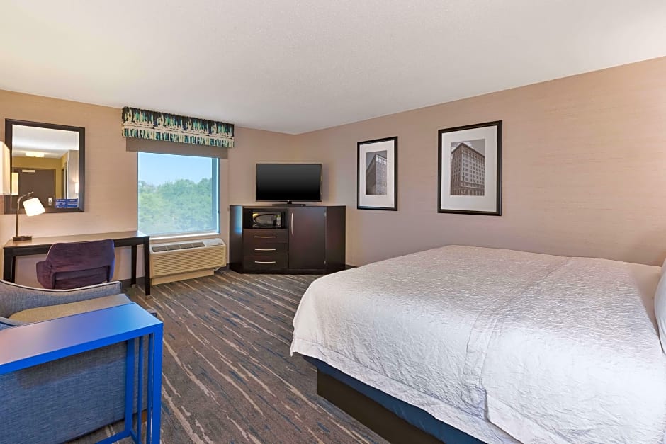 This hearing accessible, non-smoking room features one king-sized bed. The room also has a visual alarm and notification devices for the doorbell or door knock and incoming phone calls. The room features our luxurious clean and fresh Hampton bed, comfortable soft seating, whirlpool, a HDTV, and easy to operate alarm clock/radio. In the bath you will enjoy a WaterPik showerhead and curved shower rod. The free high-speed internet access will help you stay connected while on the road. If you prefer not to work at the desk, you can use the convenient lapdesk instead. You'll also enjoy the convenience of having a coffeemaker with tea service and iron/ironing board in your room. Any corresponding photo may not reflect the specific accessible room type or room feature.