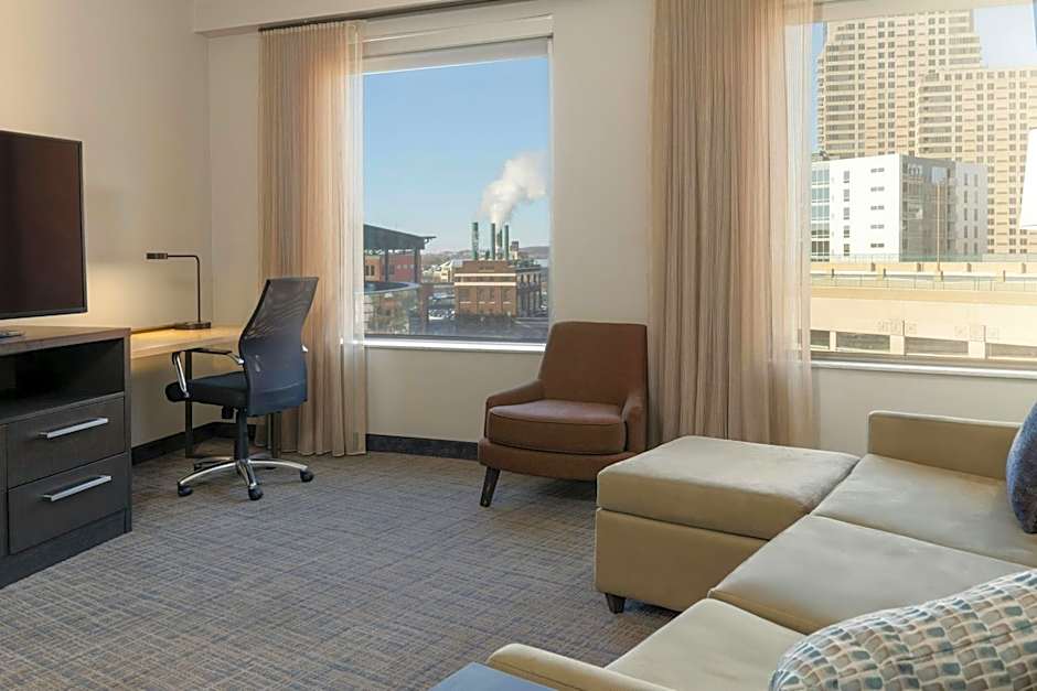The Residence Inn by Marriott Grand Rapids Downtown offers a variety of rooms including larger suites and studio options. Smoking is not allowed in any of the rooms. The rooms can accommodate between 3 and 5 adults and feature bed sizes such as Queen and King, as well as a sofa bed in each room. Some rooms also offer city views.
