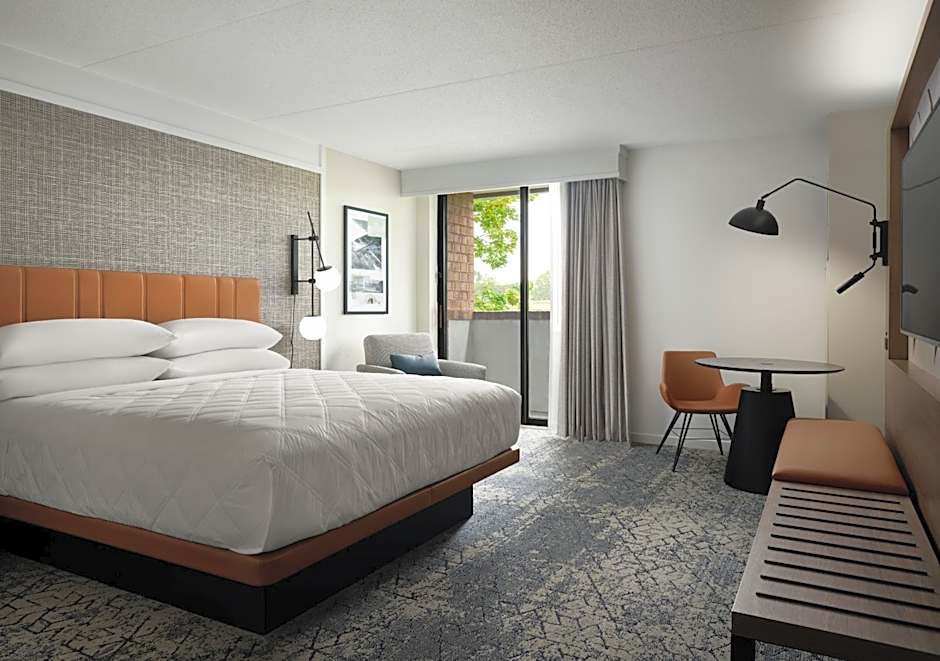 The Sheraton Grand Rapids Airport Hotel offers a variety of rooms including the Deluxe King Room with Balcony, Executive Queen Room with Two Queen Beds and Balcony, and Deluxe Queen Room with Two Queen Beds and Balcony. All rooms have a maximum occupancy of 2 adults and 1 child, do not allow smoking, and have either a king or queen size bed. Some rooms also provide access to the club lounge or have a courtyard view. The hotel also offers hearing accessible rooms with two queen beds.
