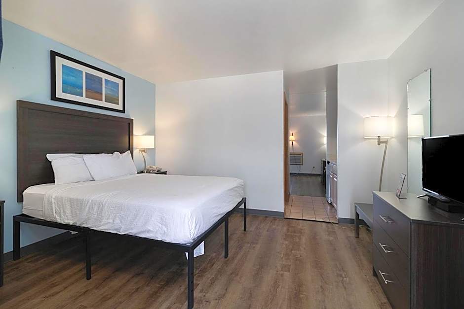 The rooms were incredibly spacious! We had a king bed with a couch, a 2 seated table and a dresser and still TONS of room to move about. Of course there was the bed with 2 night stands. It had a very minimal kitchenette with a microwave, mini fridge with separate freezer, sink and very limited dishes with soap and a sponge! The new vinyl flooring was nice too! I loved the doorwall that had two rocking chairs and a small table on the patio/balcony (we were on the 1st floor, so call it what you wish).
