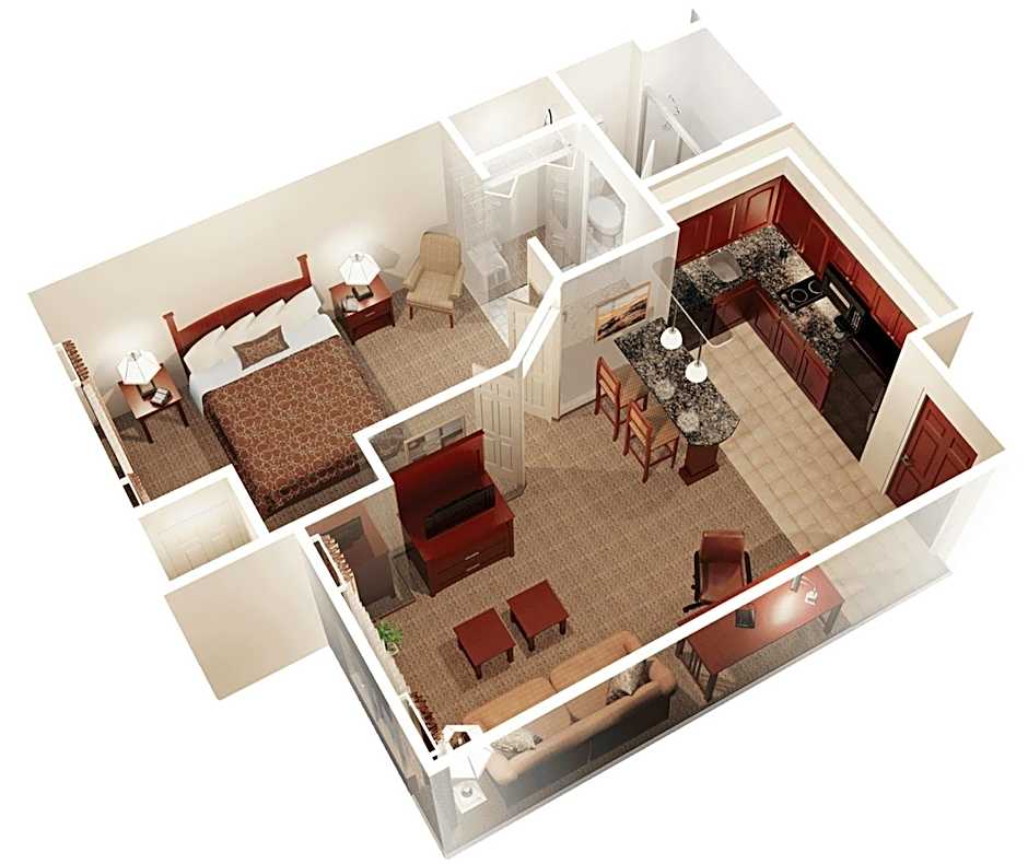 The hotel offers a variety of rooms including Studio, 1 Bedroom, 2 Bedroom Suites, and Accessible rooms. The rooms can accommodate up to 8 adults and 4 children with different bed configurations such as Queen, King, and Sofa beds. Room sizes range from 377 sqft for a Queen Studio to 775 sqft for a Two-Bedroom Suite. Smoking is not allowed in any of the rooms.