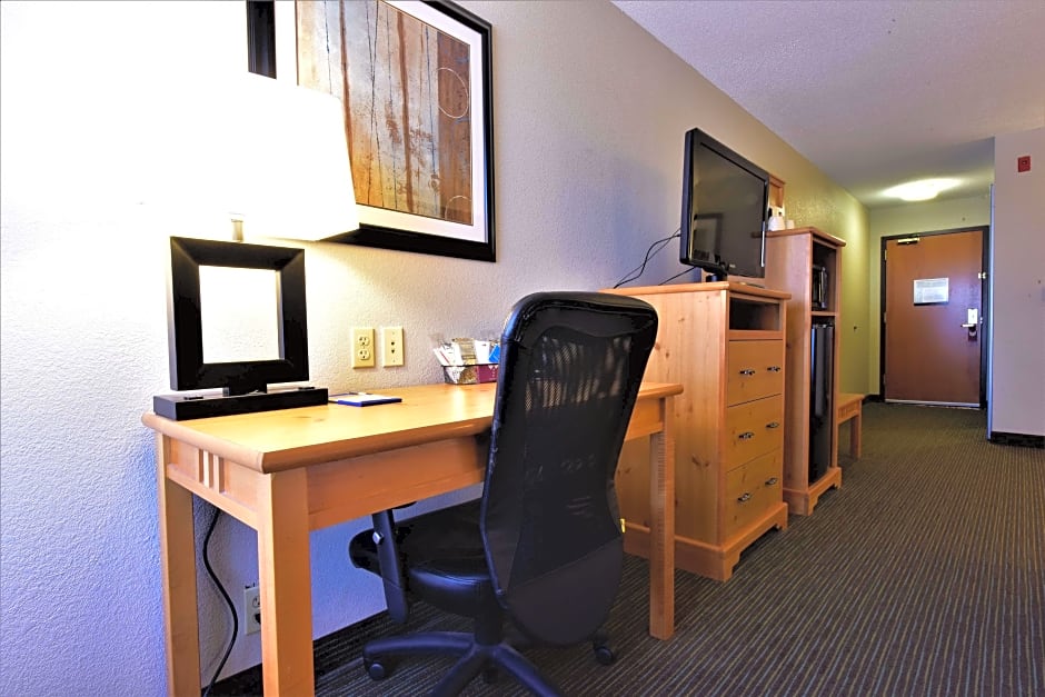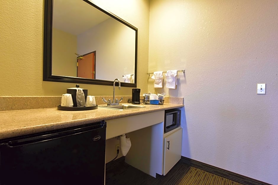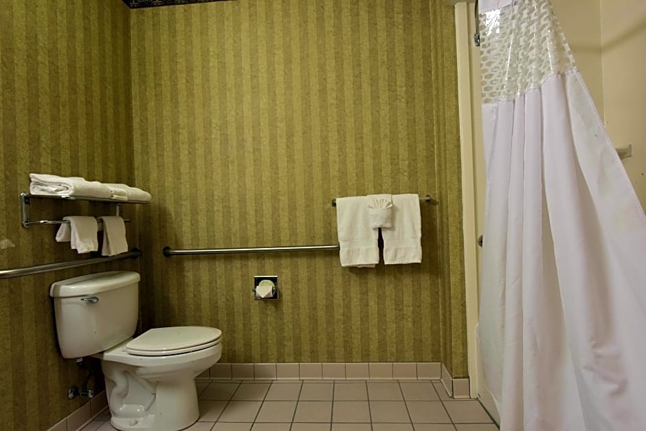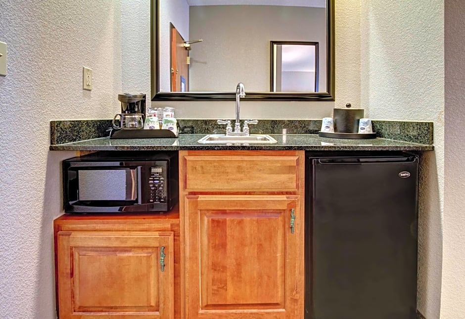 This mobility and hearing accessible, one-room, non-smoking studio suite features one king-sized bed, and an accessible roll-in shower. The suite also has a visual alarm and notification devices for the doorbell or door knock and incoming phone calls. The room features include a microwave, refrigerator, wet bar, comfortable soft seating, 32-inch LCD HDTV, and easy to operate alarm clock/radio. The free WiFi access will help you stay connected while on the road. If you prefer not to work at the desk, you can use the convenient lap-desk instead. You'll also enjoy the convenience of having a coffeemaker with tea service and iron/ironing board in your room. Any corresponding photo may not reflect the specific accessible room type or room feature.
