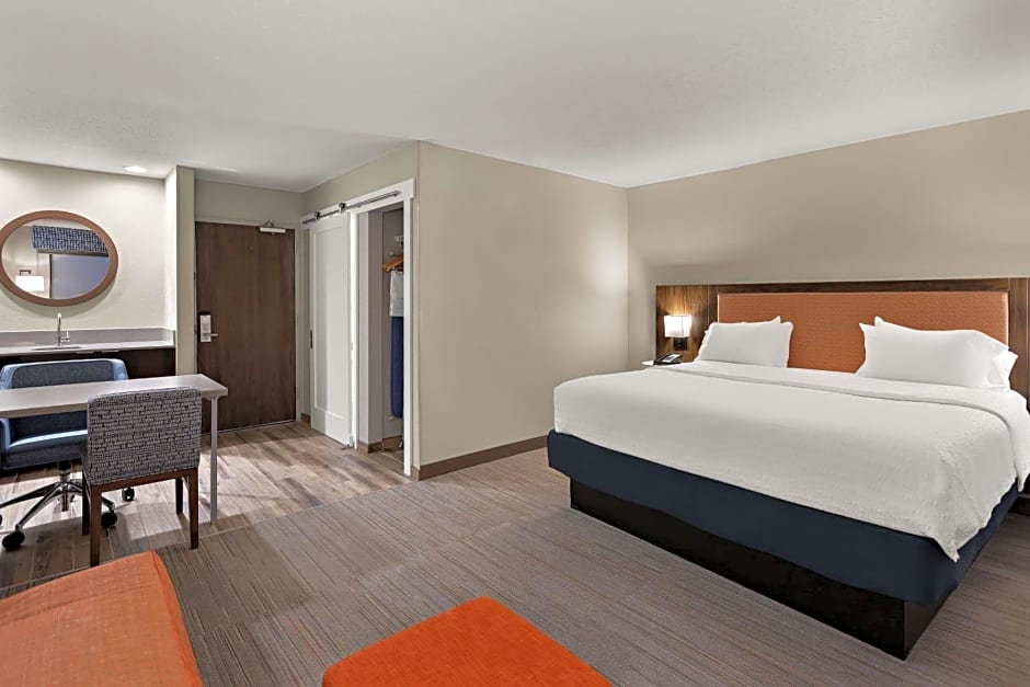 This mobility and hearing accessible, one-room, non-smoking studio suite features one king-sized bed, and an accessible bath tub. The suite also has a visual alarm and notification devices for the doorbell or door knock and incoming phone calls. The room features include a microwave, refrigerator, wet bar, comfortable soft seating, 32-inch LCD HDTV, and easy to operate alarm clock/radio. The free WiFi access will help you stay connected while on the road. If you prefer not to work at the desk, you can use the convenient lap-desk instead. You'll also enjoy the convenience of having a coffeemaker with tea service and iron/ironing board in your room. Any corresponding photo may not reflect the specific accessible room type or room feature.