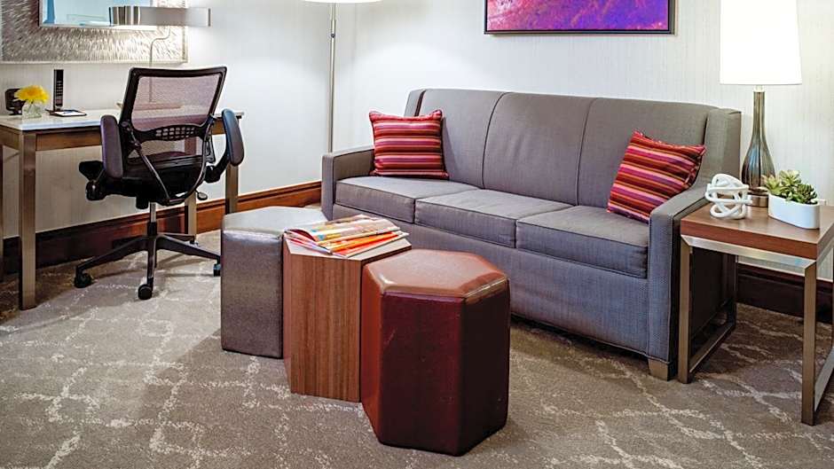 This suite features a flat-screen cable TV, seating area, and tile/marble floor. There is a sofa, refrigerator, and microwave as well.