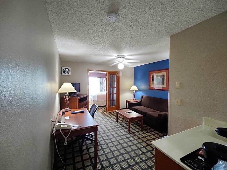 This two-room suite features a King size bed in the bedroom and a sofa sleeper in the living room.