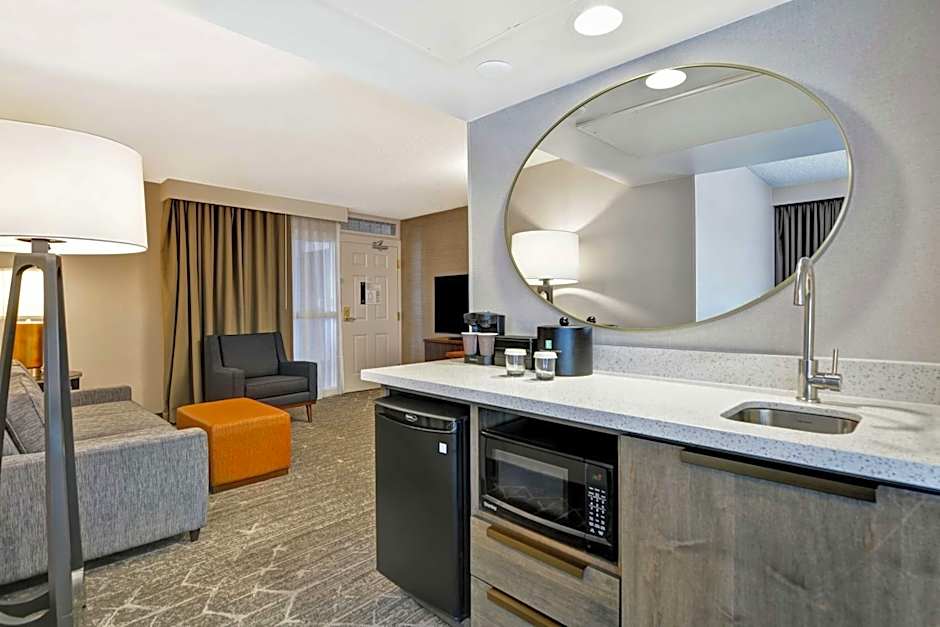 Spacious living area and private bedroom, two televisions, refrigerator, microwave and complimentary cooked-to-order breakfast and Evening Reception. The living area features sofa bed, armchair, desk with ergonomic chair, upholstered chairs, televisions, alarm clock with MP3 connection, refrigerator and microwave oven. As with all of our suites, included is a full cooked-to-order breakfast and our Evening Reception. This gives you the ability to tailor your own breakfast experience, as well as allowing you to easily unwind and relax in the evening. Each suite, as well as our lobby area, is equipped with internet access. A nominal fee applies for WiFi access (free Standard WiFi for HHonors members). This mobility accessible standard suite features one king-sized bed, and an accessible tub. Any corresponding photo may not reflect the specific accessible room type or room feature.