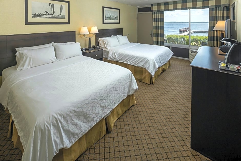 The Holiday Inn Detroit Lakes offers a variety of room types including standard queen rooms with two queen beds and beach access, deluxe queen rooms with two queen beds, king rooms with spa bath, king rooms with lake view, twin double rooms selected at check-in, queen rooms with lake view, queen rooms with two queen beds, deluxe king rooms, and superior king rooms. All rooms are non-smoking and have a room size of 323 sqft. The rooms can accommodate either 2 adults and 1 child or 4 adults and 3 children.