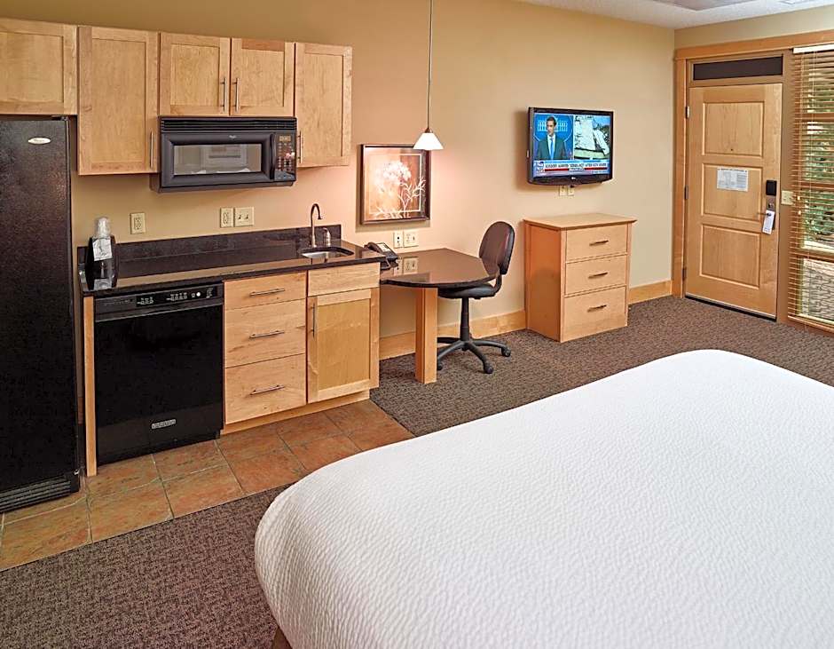 Offering a kitchenette with a wet bar, dishwasher and full-size refrigerator with an icemaker, this large room includes a flat-screen TV with premium cable channels.
