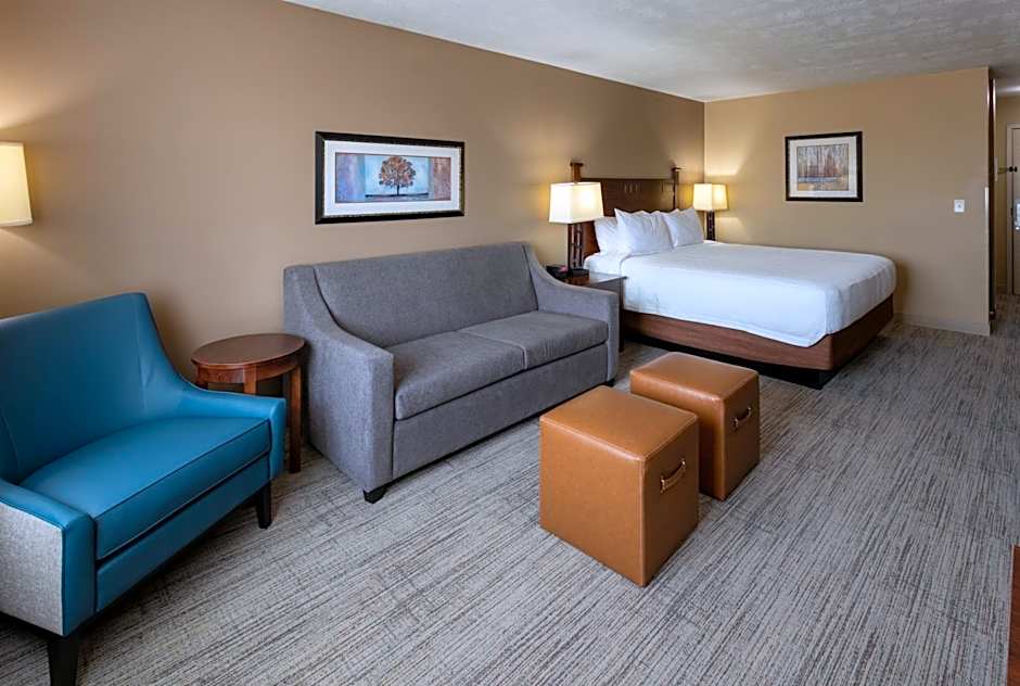 For downtime, a heated indoor pool awaits as an all-season retreat, with a shallow end and an adults-only policy for a relaxed splash. A variety of room options caters to different groups, including Queen Rooms, Quadruple Rooms with two queen beds, Deluxe Suites featuring a king bed plus a sofa bed, a Deluxe King Suite, and Studios with a king bed and sofa bed.