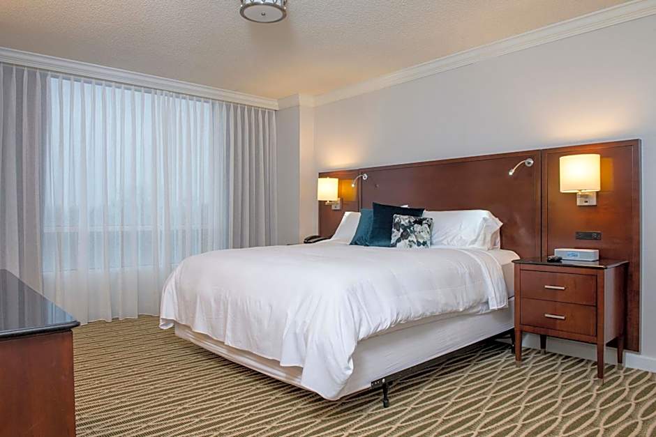 This upper floor king room features 24/23 ft Club Lounge access for complimentary food and beverages, including breakfast, high-speed Wi-Fi, and business services. In-room entertainment includes cable, premium movie channels, and Netflix on a 37-inch flat-screen TV.