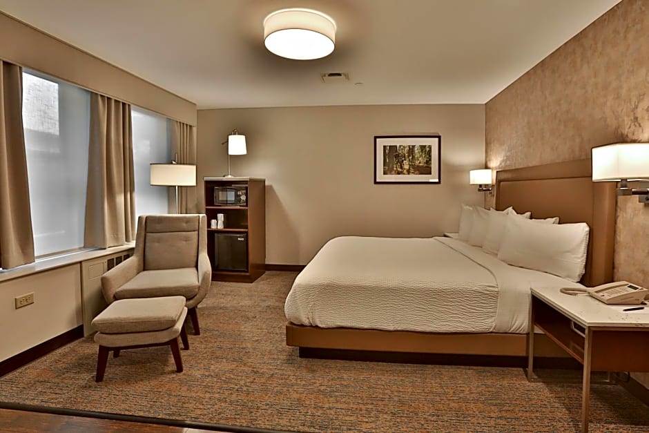 Lack of restaurant facilities. There are private restaurants in the building or connected to the building, but you will have to discover them on your own. Room was small but more than adequate. What does all that space matter when you are out of the room or while sleeping? They did an excellent job of updating the rooms in this classic and historic building.