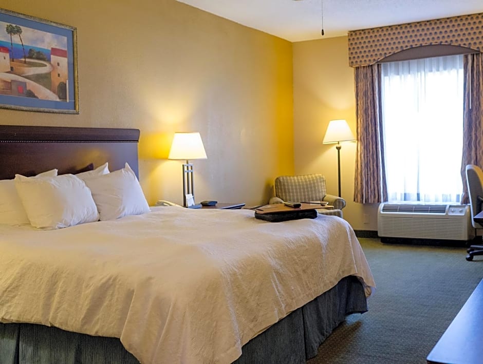 Free WiFi access, easy chair & ottoman, LCD TV, large work desk, coffeemaker Enjoy your stay in this spacious non-smoking room which contains one king-sized clean and fresh Hampton bed® and soft seating. Relax in the easy chair and watch a movie on the LCD TV or work at the desk and stay connected with free WiFi access. The bathroom provides plush towels and a shower with a WaterPik showerhead and curved shower rod to allow more light and space in the shower.