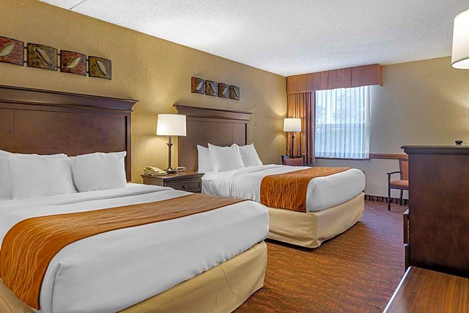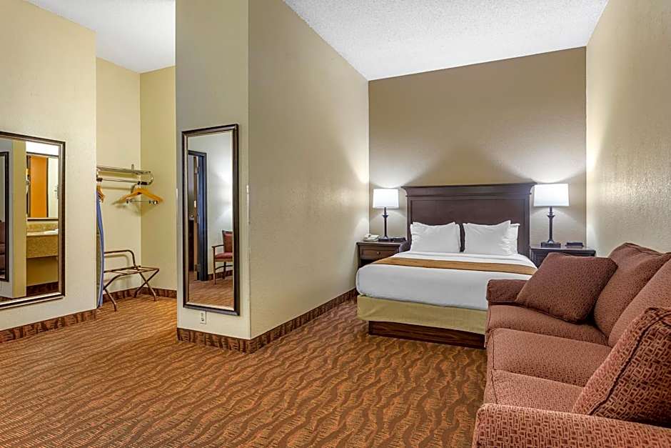 The Comfort Inn at Thousand Hills offers a variety of room types, including king rooms with whirlpools, king suites with whirlpools, standard queen rooms with two queen beds, queen suites with two or three queen beds, and accessible rooms. All rooms are non-smoking. The rooms have either one king bed or two queen beds and can accommodate up to 4 adults and 3 children or 8 adults and 4 children. The room sizes range from 291 sqft to 603 sqft.