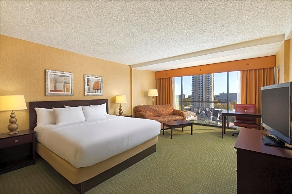 The University Plaza Hotel offers a variety of room types. These include the Poolside King with Sofabed suite, the Double Room with Two Queen Beds, the King Room, the Deluxe King Room, and the Executive Suite. Smoking is not allowed in any of the rooms. The room sizes range from 344 sqft to 560 sqft. The occupancy varies, accommodating either 2 adults and 1 child or 4 adults and 3 children. The bed sizes range from King size beds to Queen size beds, with some rooms also including a sofa bed.