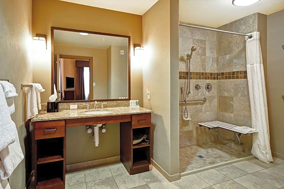 This hearing accessible non-smoking one bedroom suite with a mountain view features one king-sized bed. The room also has a visual alarm and notification devices for the doorbell or door knock and incoming telephone calls. This suites has a kitchen, built to lower scale, is fully equipped down to utensils and includes a full-sized refrigerator, microwave, dishwasher and twin burner stove. The dining area can easily double as workspace. This suite provides a private bedroom with an HDTV and a separate living area features a full-sized sofa bed, chair and HDTV. All of our suites keep you connected with complimentary internet access, telephone, and alarm clock with MP3 player capabilities and pre-set local radio stations. Any corresponding photo may not reflect the specific accessible room type or room feature.