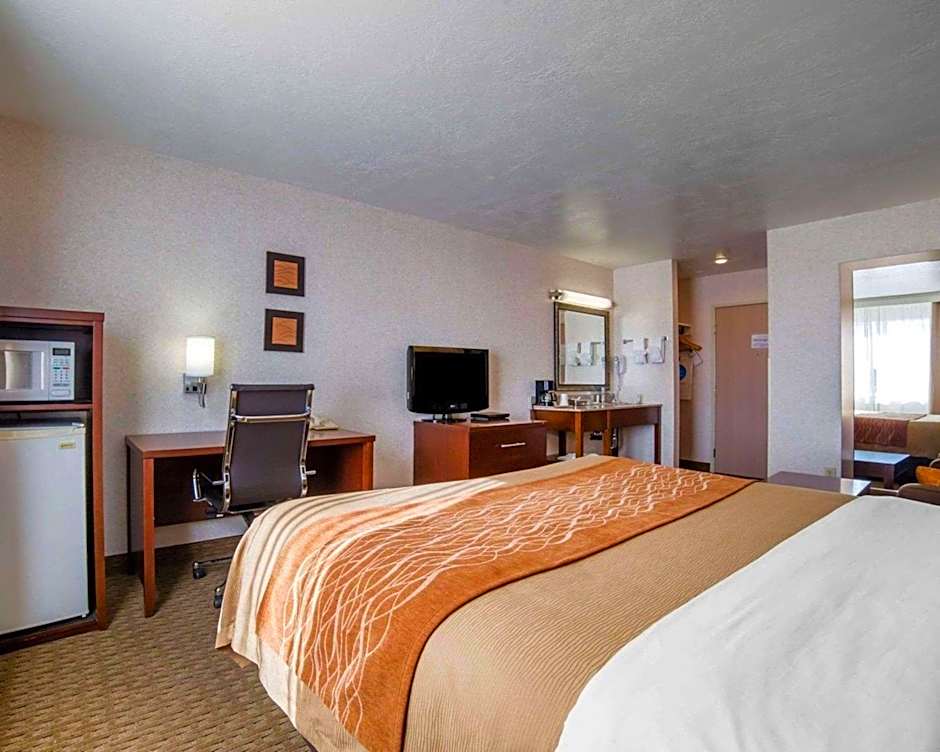 Comfort Inn Elko offers a variety of room options including King Rooms (accessible/non-smoking and non-smoking) and Queen Rooms with Two Queen Beds (non-smoking). The rooms are 280 sqft in size and smoking is not allowed. The King Rooms accommodate 2 adults and 1 child with 1 King size bed, while the Queen Rooms accommodate 4 adults and 3 children with 2 Queen size beds.