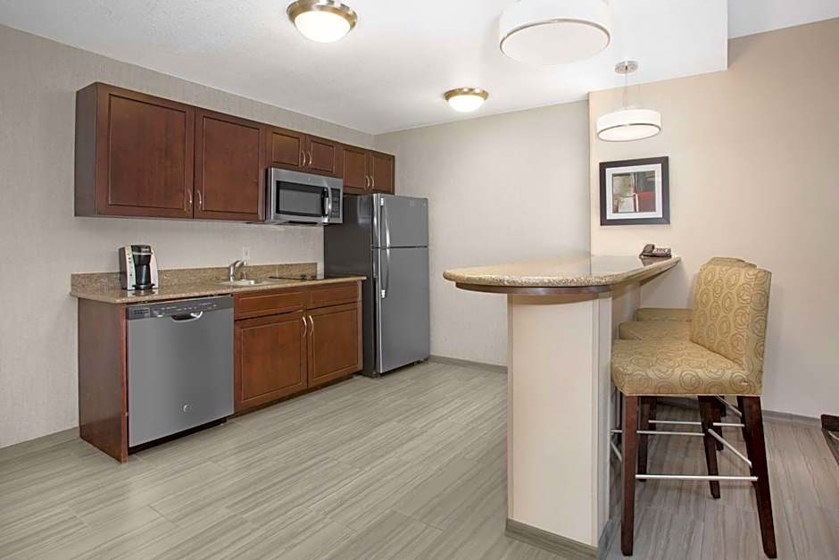 This mobility accessible non-smoking one bedroom fireplace suite features one king-sized bed, and an accessible bathtub. This suite has a kitchen, built to lower scale, is fully equipped down to utensils; and includes a full-sized refrigerator, microwave, dishwasher and twin burner stove. The dining area can easily double as workspace. This suite provides a private bedroom with a HDTV and a separate living area features a full-sized sofa bed, chair and HDTV. All of our suites keep you connected with complimentary high-speed internet access, telephone, and alarm clock with MP3 player capabilities and pre-set local radio stations. Any corresponding photo may not reflect the specific accessible room type or room feature.