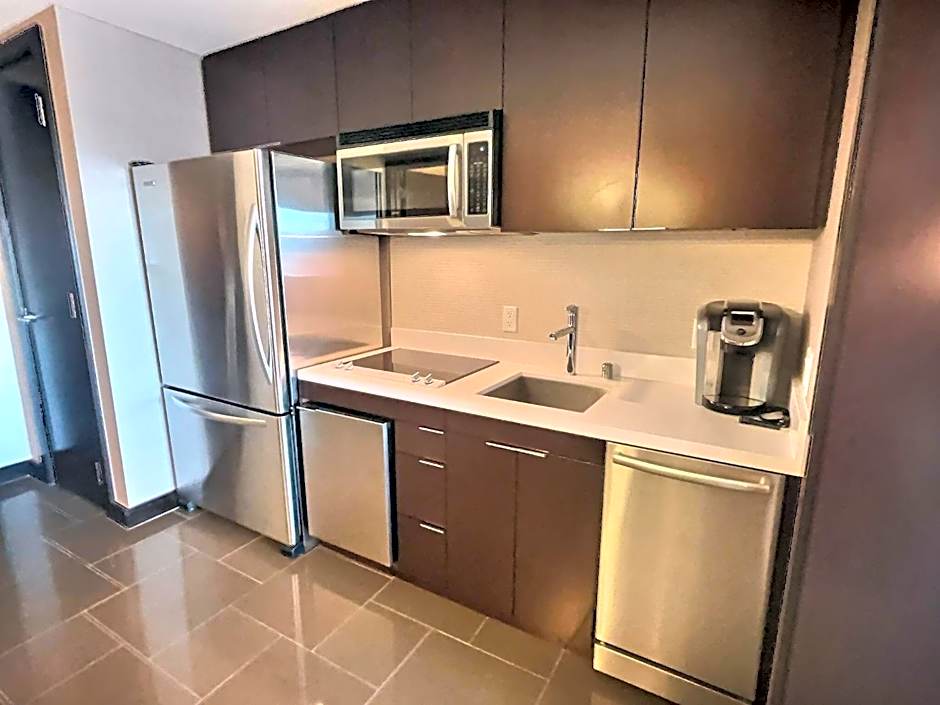 This studio is styled in modern décor. An iPod docking station and a flat-screen TV are provided. A spacious seating area with a lavish sink, a microwave and a refrigerator are offered in this air-conditioned studio.