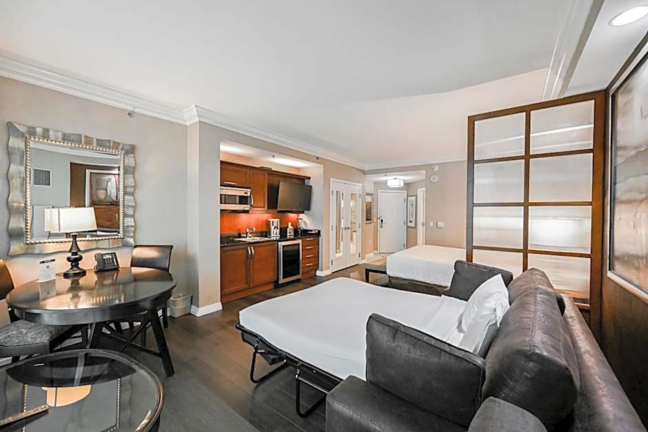 Accommodation runs the gamut from cozy Studios to spacious 2-bedroom layouts, many with balconies and different views to suit moods and plans. A standout option is the Penthouse Studio, a 1044-square-foot suite with two king beds and sofas, plus two sofa beds, accommodating up to eight adults and four children, and offering a Strip View and a balcony. Kitchenware and a kitchenette invite in-room meals, while other units showcase City View or Balcony perks, giving guests plenty of choice for style and space.