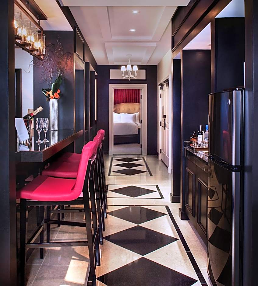 Reminiscent of a Parisian-style apartment, this room offers hardwood floors, plush seating and antique trunk-style furnishings. The room's neutral tones and berry accents provide a relaxing, glamorous vibe. The room has a 55-inch flat-screen TV, high-end bath products and hallway coffee service.