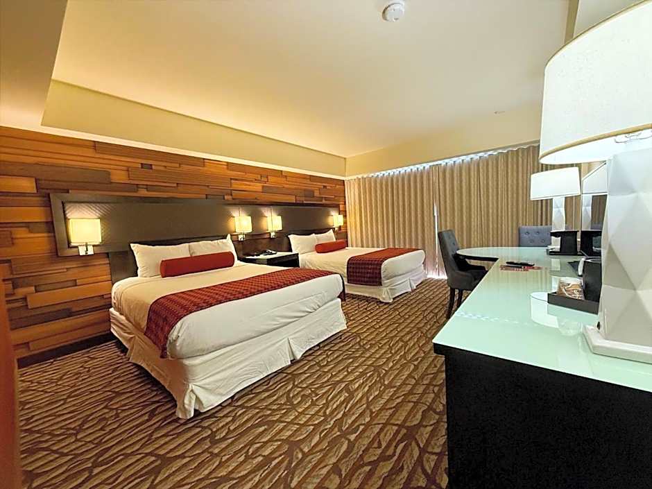 This classic two queen room features spacious tiled shower. Free basic Internet and a 40" flat-screen TV are included. A coffee/tea maker, desk and air conditioning are also featured.