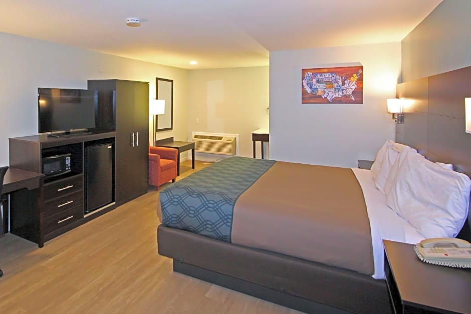Nice little motel/hotel right on the highway. Quiet, good internet connection, decent beds, e-z in and out as we could pull our car right up to the door. Laundry, pool, etc. They have both pet rooms and pet free rooms, which we appreciated. Good value for the price. Small but well stocked little breakfast area. Staff available 24/7 for any concerns. Very clean.