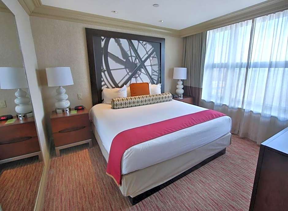 The Tribune Suite surrounds its guests with indulgence fit for Caesars legacy. Enjoy a 675-square-foot space featuring modern décor, a king size bed, accent lighting around the TV and headboard, and a seating area with a stone-topped table. This room also includes abundant convenience outlets along with an HDMI port to connect your device to our 55" flat screen TV.