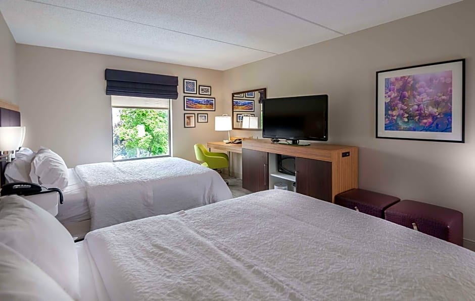 Microwave, refrigerator, work area, free WiFi, tea/coffeemaker Have a relaxing stay in this queen guest room that features 2 clean and fresh Hampton beds®. Watch your favorite show on TV, work at the spacious desk and keep in touch with free WiFi. The room boasts a refrigerator, a microwave and a tea/coffeemaker to help you feel at home. The bathroom offers fluffy towels, a WaterPik® showerhead and curved shower rod for added space and light.