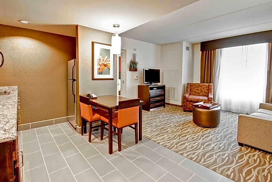 This mobility and hearing accessible non-smoking one bedroom suite features one king-sized bed, and an accessible bathtub. This suite also has a visual alarm and notification devices for the doorbell or door knock and incoming telephone calls. This suite has a kitchen, built to lower scale, is fully equipped down to utensils; and includes a full-sized refrigerator, microwave, dishwasher and twin burner stove. The dining area can easily double as workspace. This suite provides a private bedroom with an HDTV and a separate living area features a full-sized sofa bed, chair and HDTV. All of our suites keep you connected with complimentary high-speed internet access, telephone, and alarm clock with MP3 player capabilities and pre-set local radio stations.