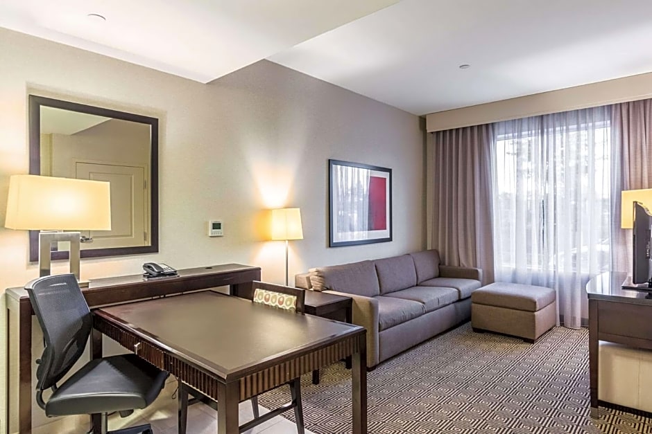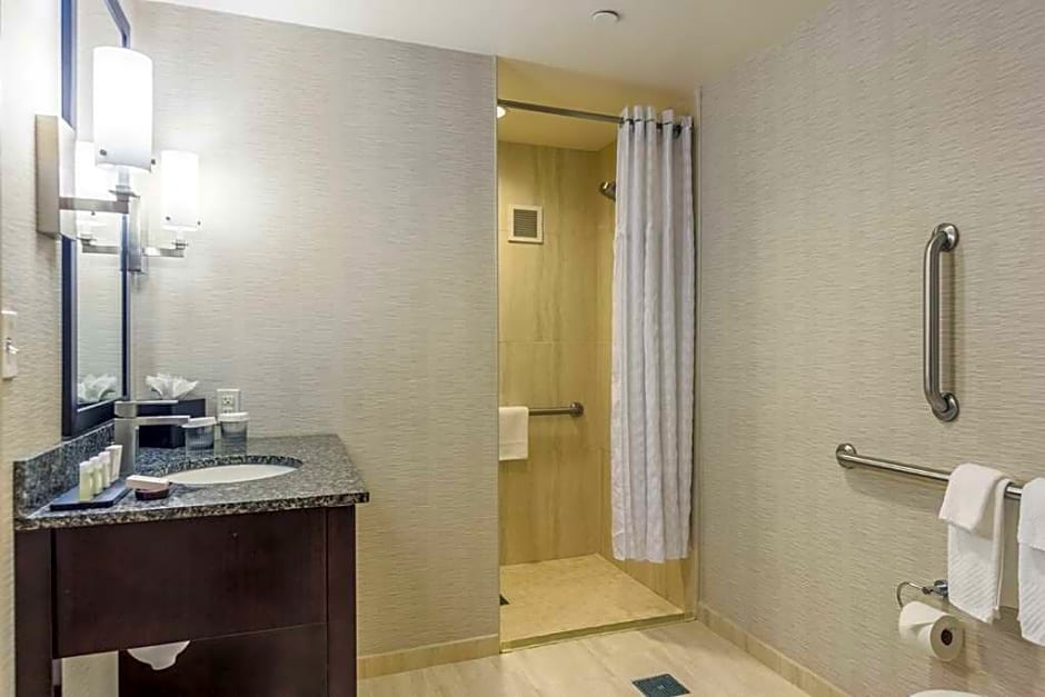 This mobility accessible standard suite features one king-sized bed and a roll-in shower. Spread out and unwind in our beautifully designed King Suites which feature a separate bedroom and living room. This spacious non-smoking suite features a king-sized Serta Sweet Dreams bed set and the 300-thread count Embassy Essentials bedding collection as well as a 39-inch flat-screen HD television. The separate living room offers a full-sized sofa sleeper as well as a refrigerator, microwave oven, coffeemaker, full-sized iron/ironing board, hairdryer and custom voicemail. In-room work space features an oversized desk with side table, ergonomic work chair and WiFi. In addition, this well-lit space offers another 39-inch flat-screen HD television. Your rate includes a daily full Cooked-to-Order Breakfast and a two-hour complimentary Evening Reception featuring your favorite beverages. Any corresponding photo may not reflect the specific accessible room type or room feature.