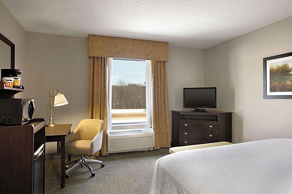 Free WiFi, 32-inch LCD TV, work desk, coffeemaker, shower Unwind in this spacious non-smoking guest room which features our king-sized clean and fresh Hampton bed®, and a 32-inch LCD TV. Catch up on work at the large desk, or surf the web with free WiFi access. For added convenience, the room is also equipped with a microwave, a mini-fridge. Refresh in the bathroom which a WaterPik showerhead and curved shower rod that allows more light and space in the shower.