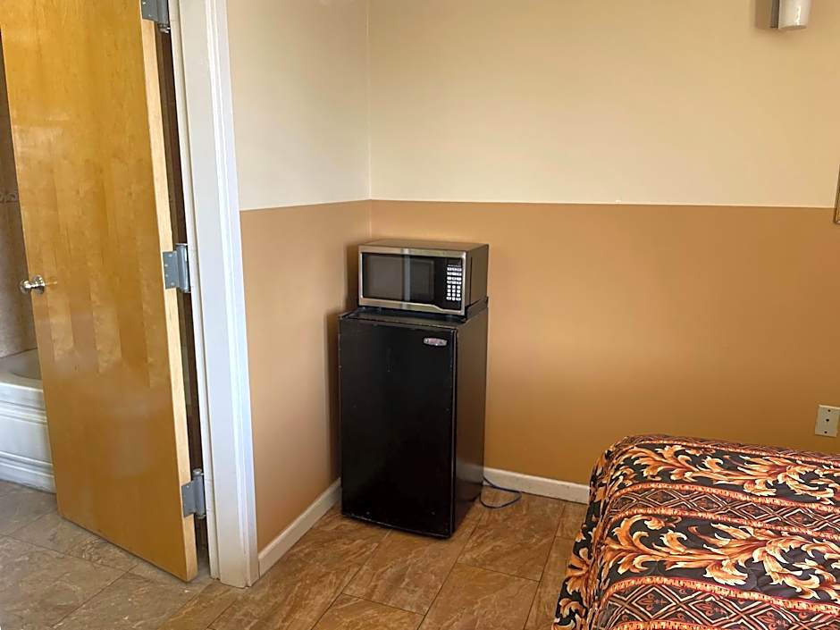 This room features a microwave, refrigerator, and satellite TV.